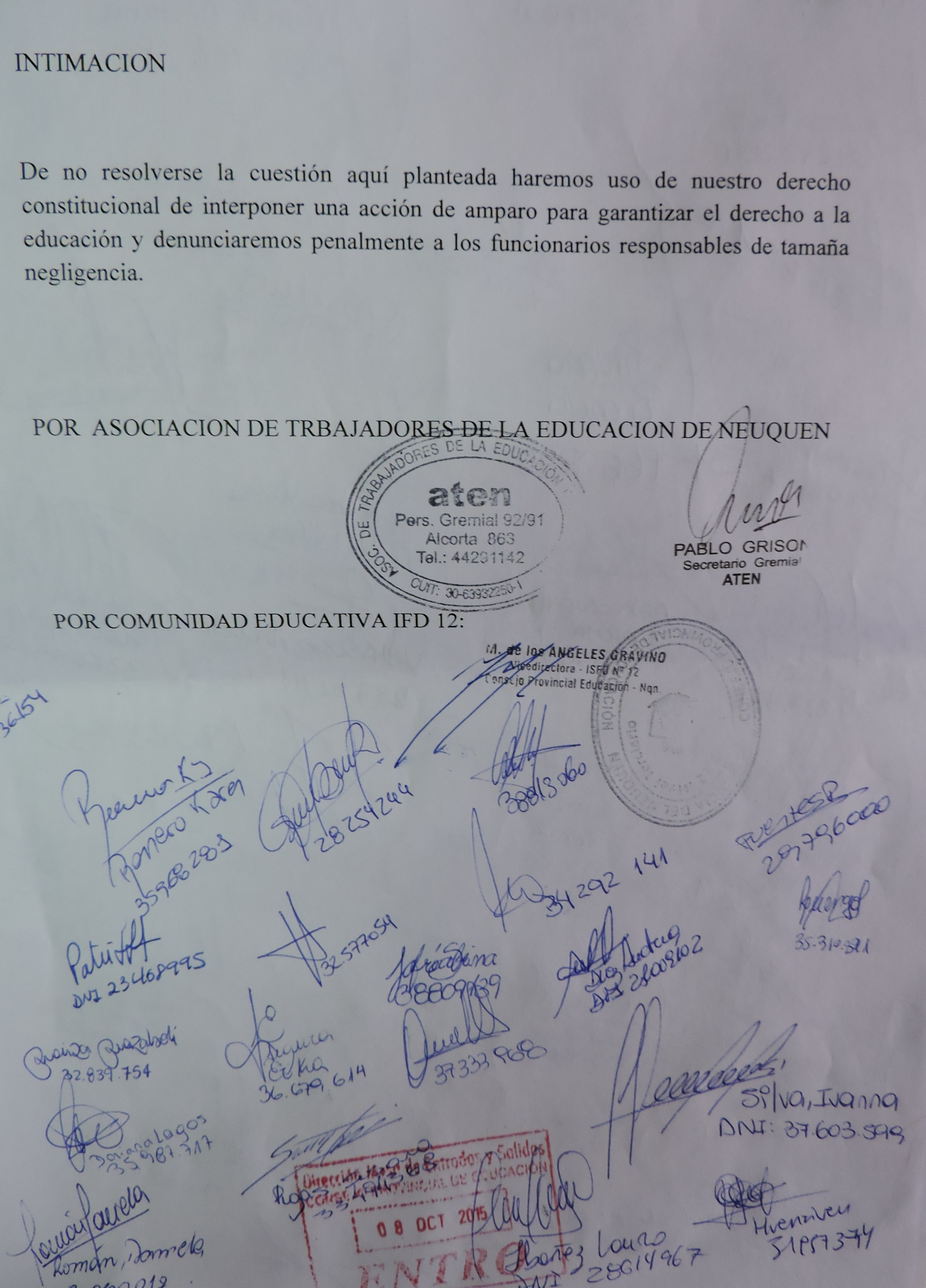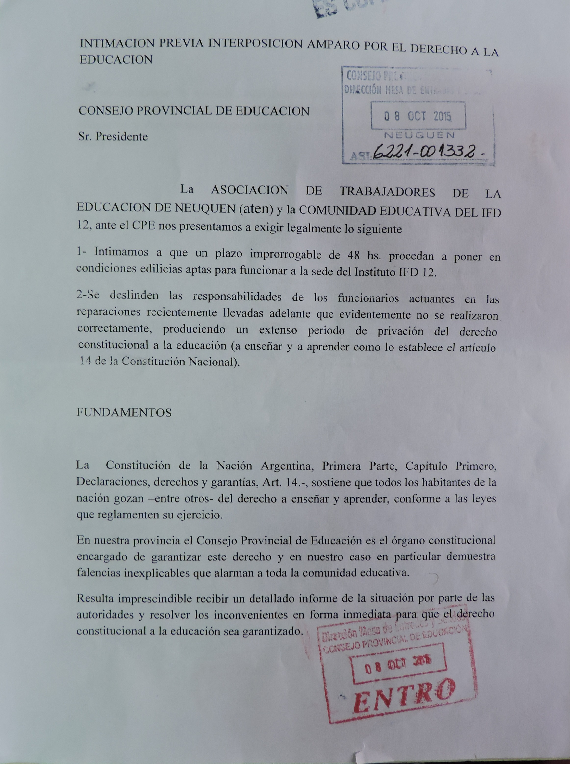 Ante la grave situación edilicia que atraviesa el IFD 12, Aten junto a la comunidad educativa del instituto presentó un escrito al consejo Provincial de Educación intimando “a que en un plazo improrrogable de 48 horas procedan a poner en condiciones edilicias aptas para funcionar a la sede del IFD 12”. En este mismo escrito además que se señalan “las responsabilidades de los funcionarios actuantes en las reparaciones recientemente llevadas adelante que evidentemente no se realizaron correctamente, produciendo en extenso período de privación del derecho constitucional a la educación”. En el escrito planteamos que “de no resolverse la cuestión planteada haremos uso de nuestro derecho constitucional de interponer una acción de amparo para garantizar el derecho a la educación y denunciaremos penalmente a los funcionarios responsables de tamaña negligencia”.