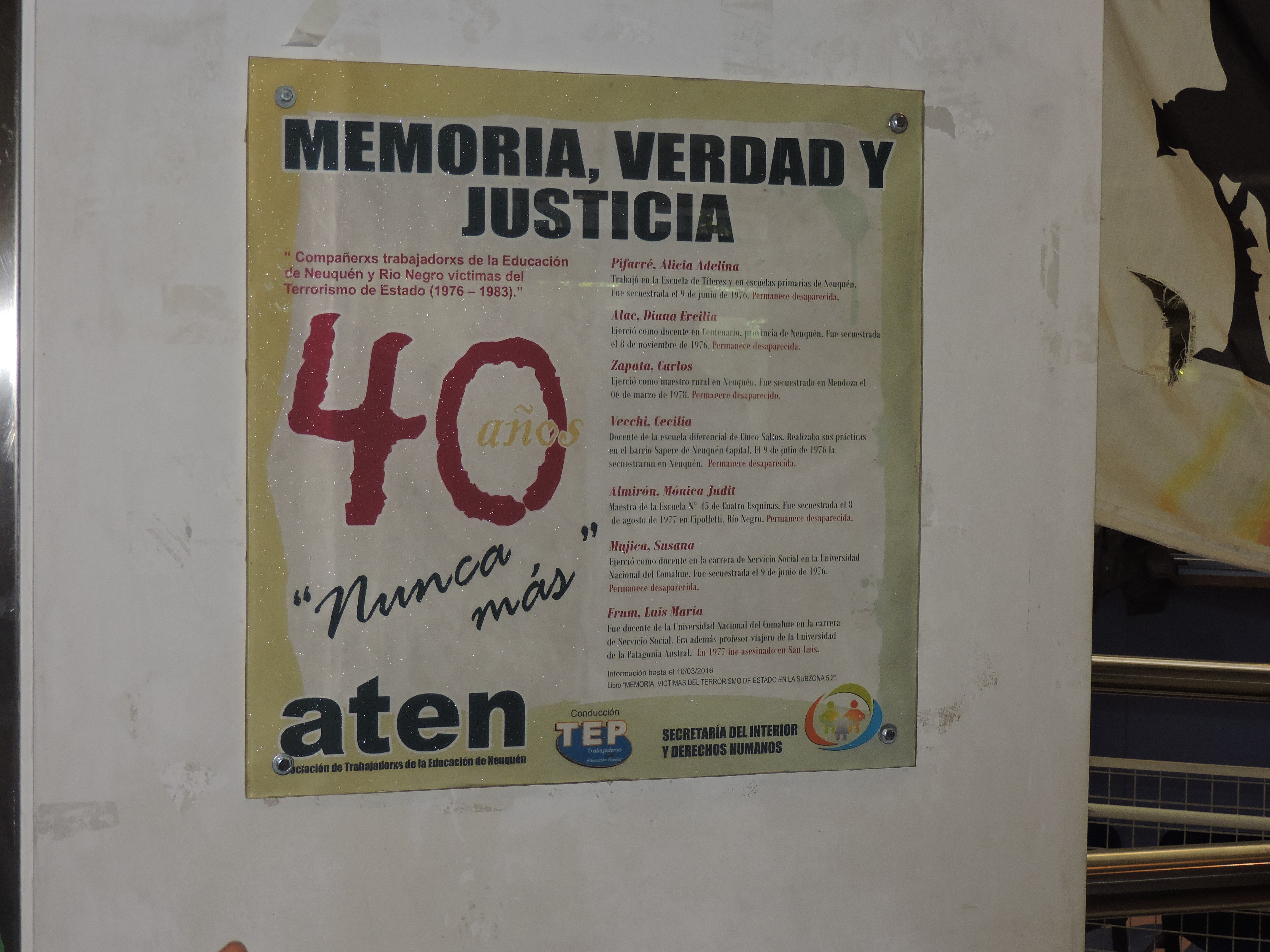 Hoy, 23 de marzo, realizamos un acto en el Consejo Provincial de Educación a la memoria de los compañeros y compañeras docentes desaparecidos y desaparecidas en el Alto Valle durante la dictadura cívico militar de 1976. Además, la biblioteca del Centro de Documentación del CPE llevará el nombre de la docente neuquina desaparecida Alicia Pifarré, por resolución del Cuerpo Colegiado del Consejo Provincial de Educación.