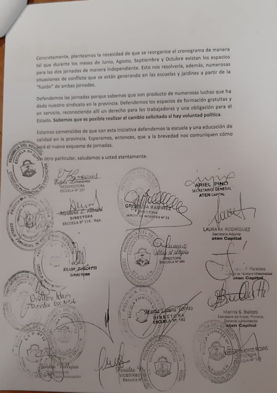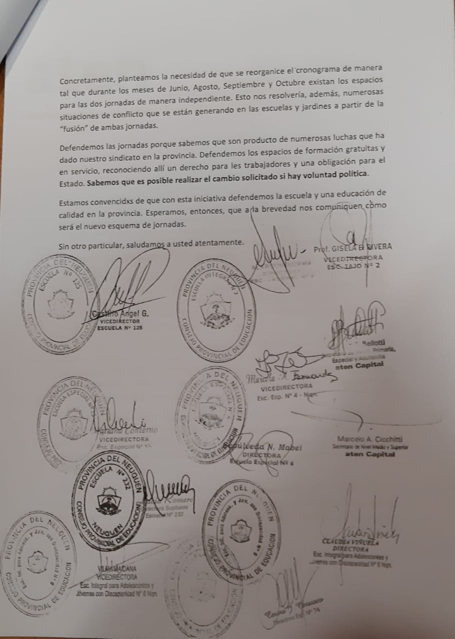 De esta manera, también se podrían resolver numerosas situaciones de conflicto que se están generando en las escuelas y jardines a partir de la “fusión” de ambas jornadas. Defendemos las jornadas porque sabemos que son producto de numerosas luchas que ha dado nuestro sindicato en la provincia. Defendemos los espacios de formación gratuitas y en servicio, reconociendo allí un derecho para les trabajadores y una obligación para el Estado.