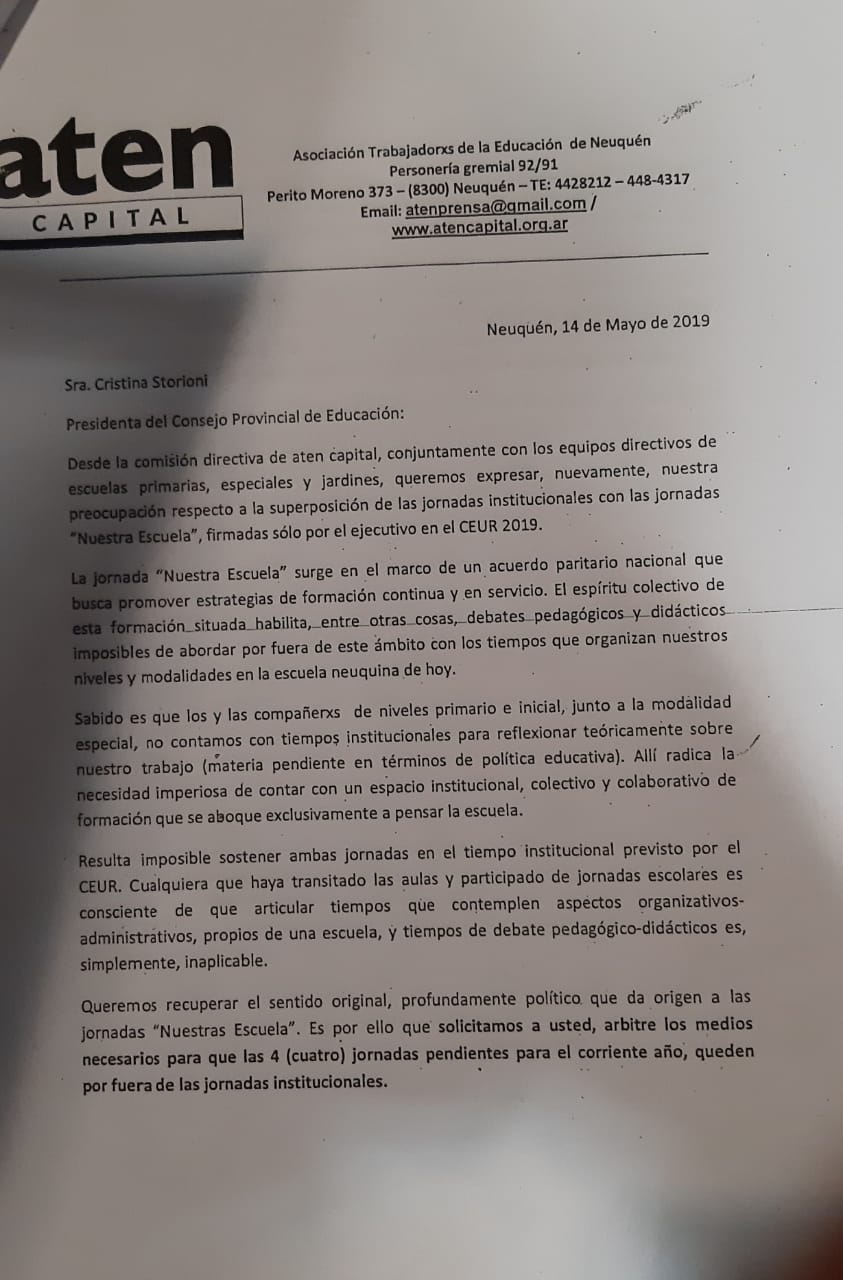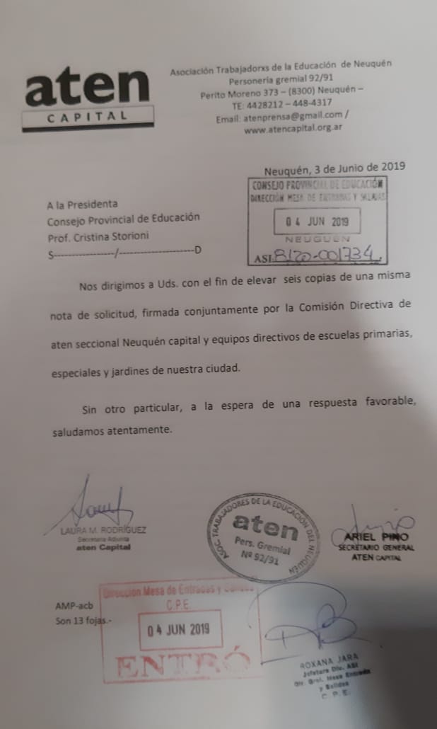 En el día de hoy, martes 4 de junio, Ariel Pino, Sec. Gral. y Marina Bellotti, Sec. de Nivel primario, inicial y modalidad especial de aten capital, se presentaron en el CPE para hacer efectivo un reclamo por escrito en defensa de las jornadas institucionales. Ante la medida unilateral y arbitraria del gobierno de superponer las Jornadas Institucionales y las de «Nuestra escuela», como CD de la seccional planteamos la necesidad de que se reorganice el cronograma de manera tal que durante los meses de Junio, Agosto, Septiembre y Octubre existan los espacios para las dos jornadas de manera independiente.