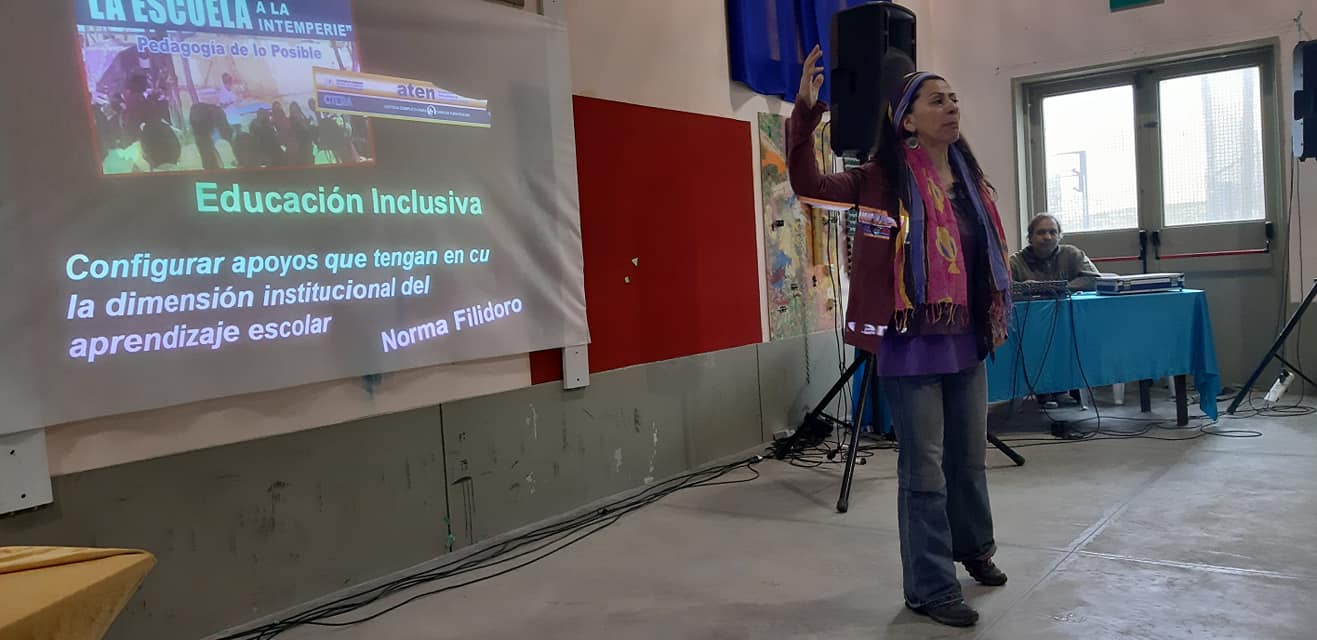 Con la organización de aten capital y la escuela especial Quelluen, desde las 9hs, empezó el curso-taller: «La escuela a la intemperie» a cargo de Norma Filidoro.